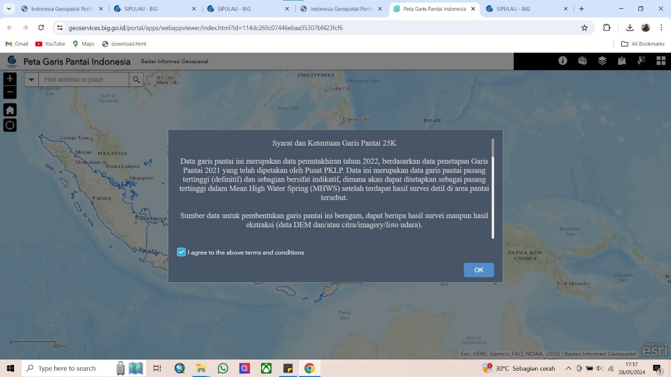- Garis Pantai 25K menggunakan geoservice.big.go.id sebagai berikut, yang di-download tanggal 28 Mei 2024.